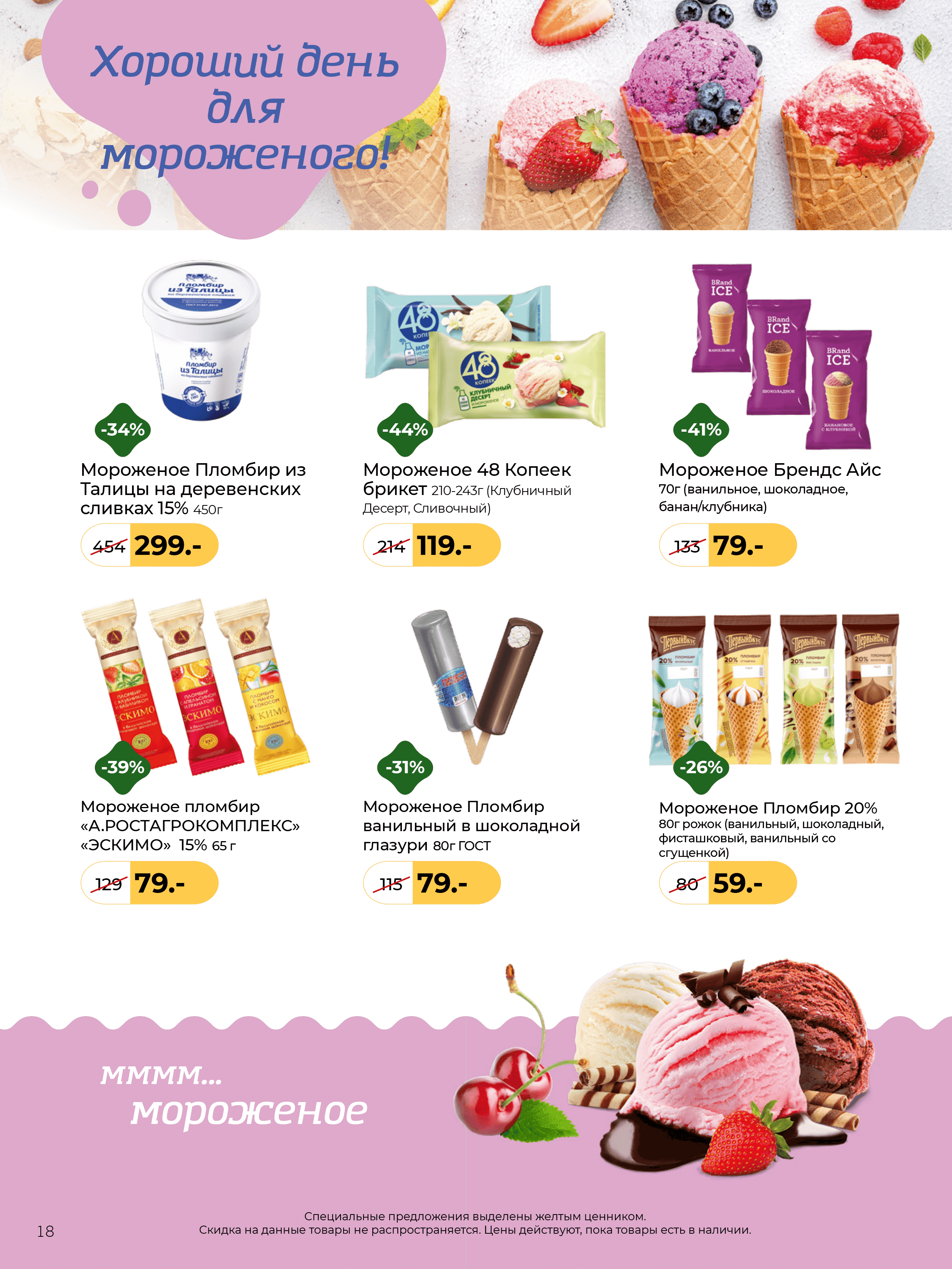 - Специальные предложения выделены жёлтым ценником.
